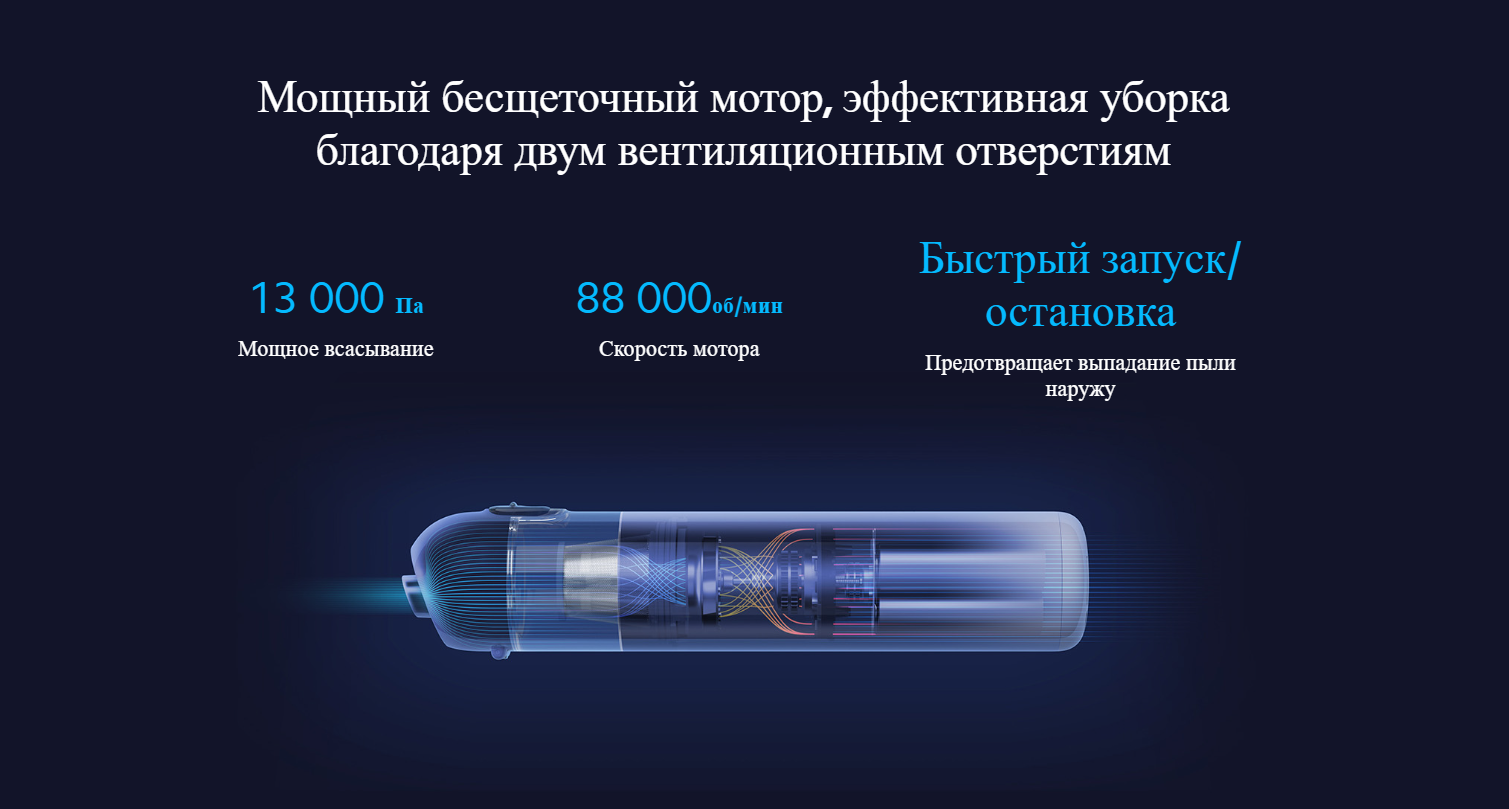 Особенности | многофункциональные насадки, высокоэффективный бесщеточный мотор и прямая конструкция с двумя вентиляционными отверстиями снижают потери энергии и повышают эффективность очистки |