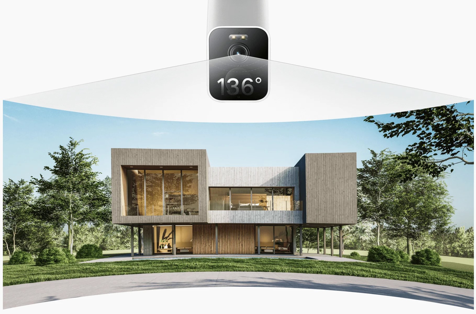Камера оснащена широкоугольным объективом 136° для более широкого поля обзора, что сокращает слепые зоны и повышает вашу безопасность за счет более четких изображений и более подробных отснятых материалов.