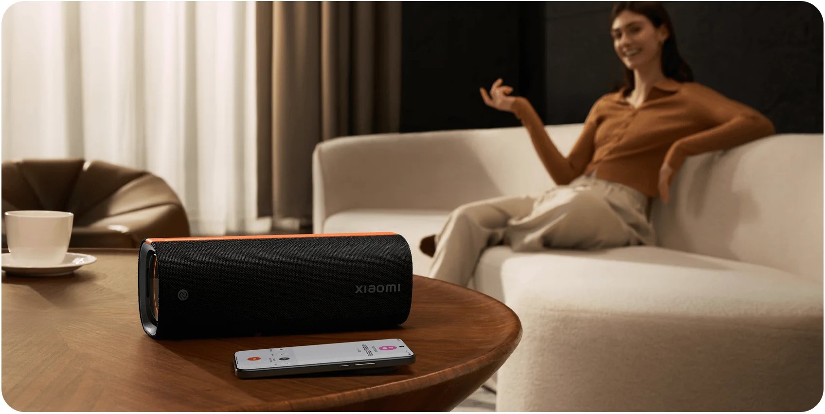 Xiaomi Sound Party NS7 выполнена в стильном корпусе с чёрной отделкой и оранжевыми акцентами. Колонка получила пластиковый корпус с влагозащитой по стандарту IP67, что делает её устойчивой к дождю и пыли. Она компактна и удобна для переноски, а эффектная многоцветная подсветка синхронизируется с ритмом музыки и создаёт атмосферу вечеринки.