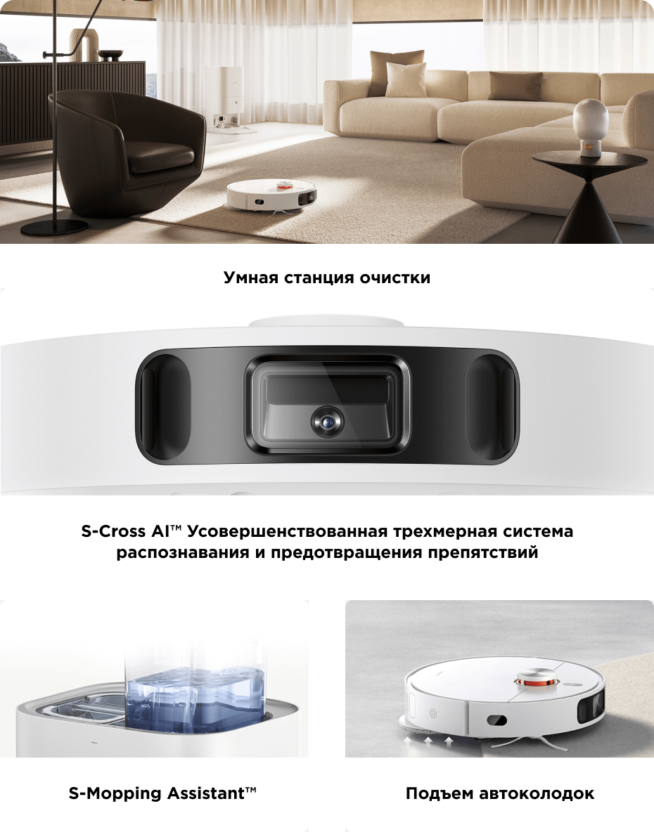 Другие функции и возможности | автоматический забор мусора, заполнение контейнера водой, зарядная станция, полоскание мопов, автоматическое возвращение на зарядную станцию, голосовое управление через ассистентов |