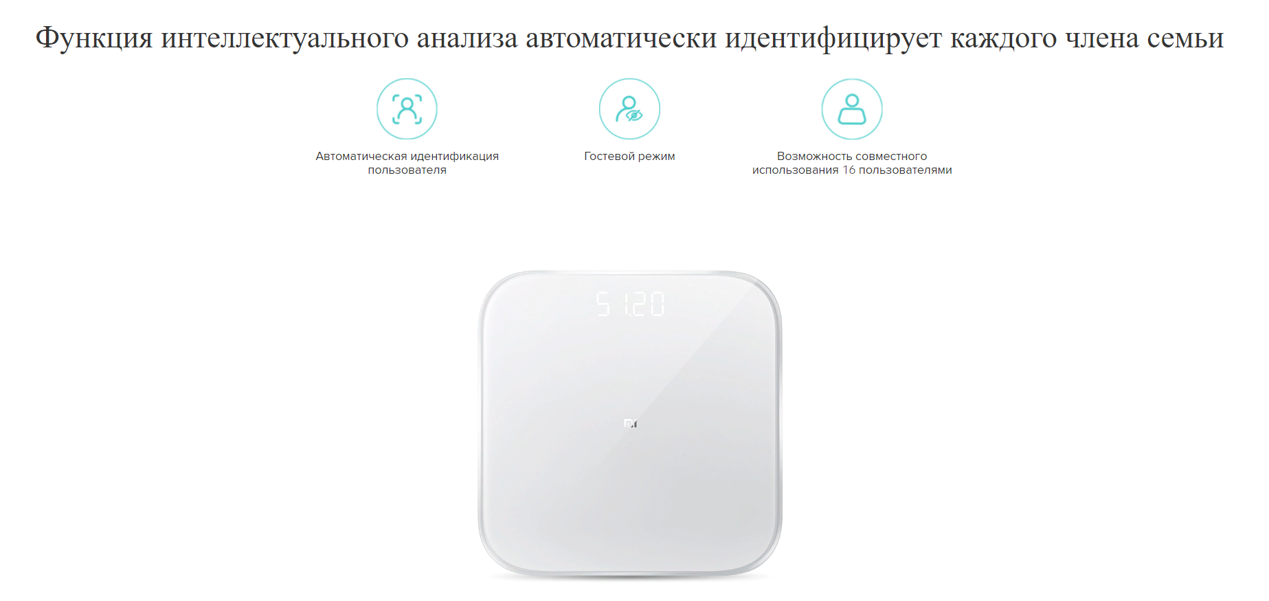 Весы Mi Smart Scale 2 могут автоматически идентифицировать членов семьи на основе данных тела и поддерживают до 16 пользователей, если устройство используется всей семьей. Также поддерживается гостевой режим, чтобы измерения других людей можно было выполнять без сохранения.